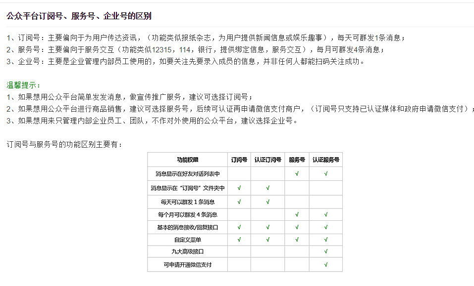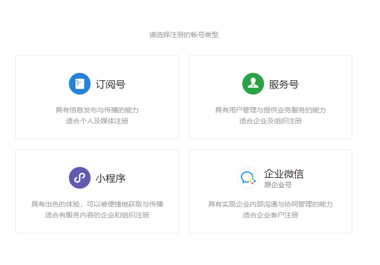 了解訂閱號(hào)、服務(wù)號(hào)和企業(yè)微信的區(qū)別后,選擇想要的帳號(hào)類型;