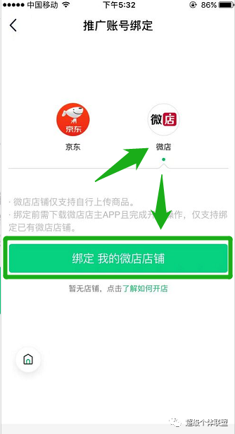 4.選擇微店,點(diǎn)擊【綁定我的微店店鋪】。