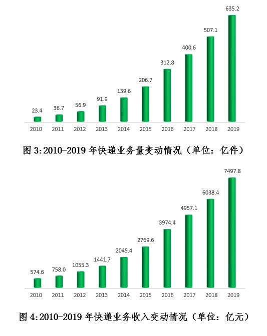 市場(chǎng)規(guī)模中高速增長(zhǎng)。2019年,全國(guó)快遞企業(yè)日均快件處理量超1.7億件,同比增長(zhǎng)25.3%,最高日處理量達(dá)5.4億件,同比增長(zhǎng)28.5%。全國(guó)快遞業(yè)務(wù)量突破600億件,累計(jì)完成635.2億件,同比增長(zhǎng)25.3%,增量規(guī)模連續(xù)兩年超過100億件。快遞業(yè)務(wù)收入累計(jì)完成7497.8億元,同比增長(zhǎng)24.2%,量收增速差從去年的4.8%進(jìn)一步縮小為1.1%,行業(yè)逐漸由規(guī)模單向驅(qū)動(dòng)向規(guī)模效益雙向驅(qū)動(dòng)轉(zhuǎn)變。與2010年相比,快遞業(yè)務(wù)量收分別增長(zhǎng)了26.1倍和12.0倍,業(yè)務(wù)收入年均復(fù)合增長(zhǎng)率是同期國(guó)內(nèi)生產(chǎn)總值增速的4倍,成為拉動(dòng)經(jīng)濟(jì)增長(zhǎng)的重要?jiǎng)恿Α?/span>
