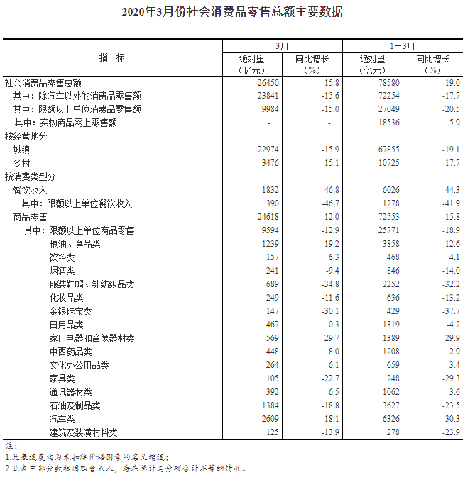 消費(fèi)方面,3月份,社會消費(fèi)品零售總額26450億元,同比下降15.8%(扣除價格因素實(shí)際下降18.1%,以下除特殊說明外均為名義增長),降幅比1-2月份收窄4.7個百分點(diǎn)。其中,除汽車以外的消費(fèi)品零售額23841億元,下降15.6%。