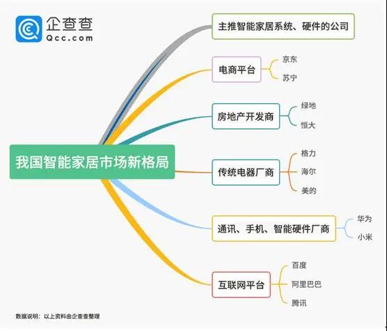 不過,目前中國智能家居市場正在形成新的格局,企查查整理了部分涉足智能家居的品牌,大致分布在這六大陣營:主推智能家居概念的智能家居系統(tǒng)和智能家居硬件初創(chuàng)公司陣營;以格力、海爾、美的等為代表的傳統(tǒng)電器廠商陣營;以華為、小米等為代表的通訊、手機、智能硬件廠商陣營;以BAT為代表的互聯(lián)網平臺陣營;以京東、蘇寧等為代表的電商平臺;以綠地、恒大為代表的房地產開發(fā)商。